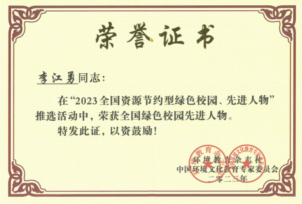 近日,在由中国环境文化教育专家委员会、生态环境部主管的《环境教育》杂志社共同开展的“2023全国资源节约型绿色校园、先进人物”推选活动中,我校被评为“全国资源节约型绿色校园”,后勤处(集团)李江勇同志被评为“全国绿色校园先进人物”。