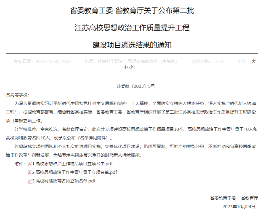 近日,省委教育工委、省教育厅公布了第二批江苏高校思想政治工作质量提升工程建设项目遴选结果,我校1人获高校思想政治工作中青年骨干建设项目立项,并推荐至教育部参评该类项目,1人获高校网络教育名师立项。此外,我校申报的1项学生心理健康教育指导典型案例项目被推荐至教育部参评该类项目。