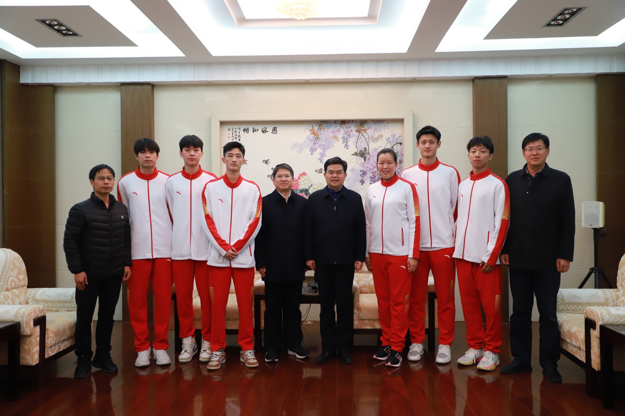 11月20日下午,校党委书记李洪波,校党委常委、副校长、校体工委主任邹小波在行政一号楼会议室接见获得第一届全国学生(青年)运动会男排冠军的我校教练员和运动员。