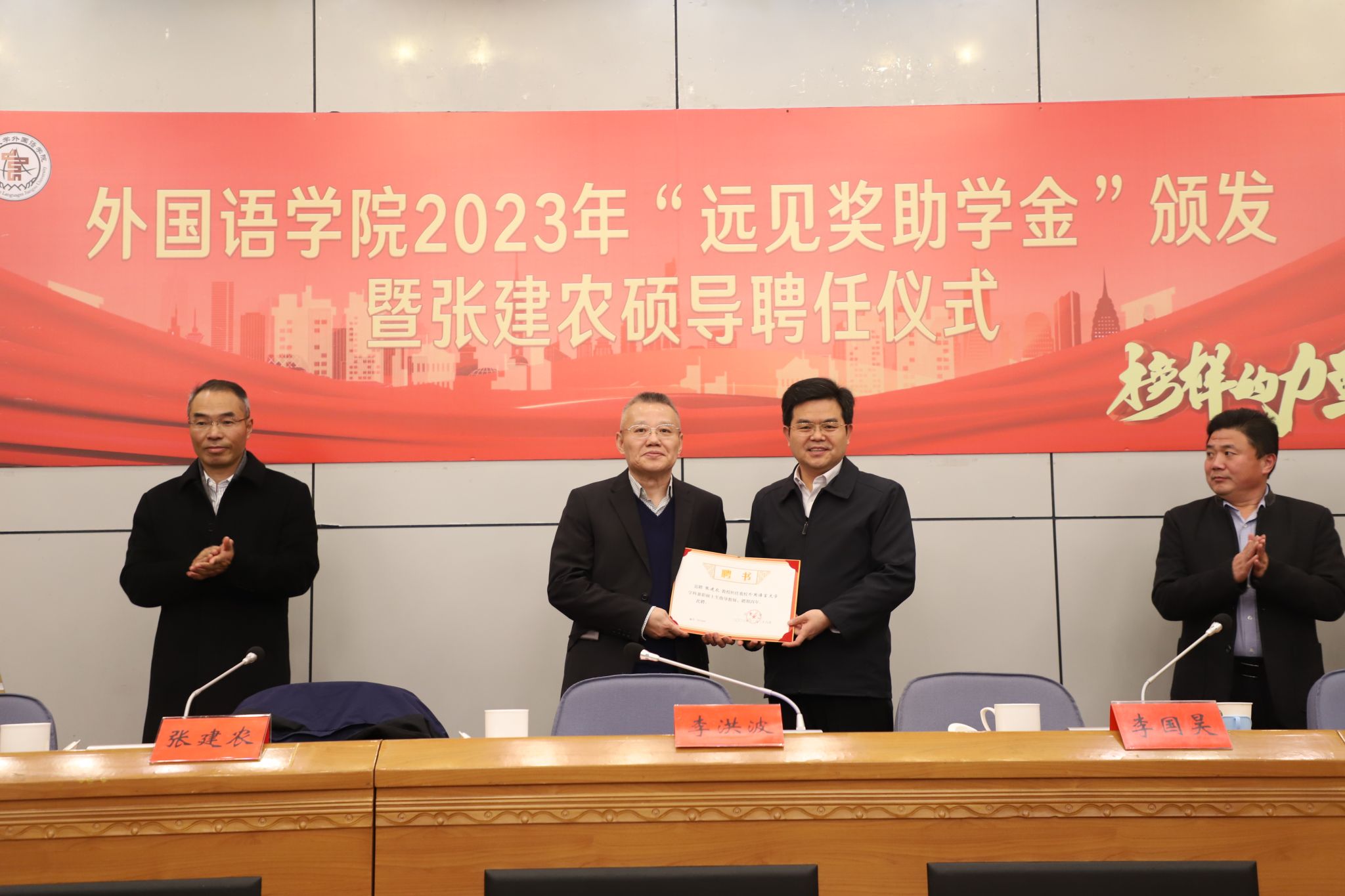 李洪波为张建农颁发硕导聘书,并对其关心支持母校办学育人事业表示衷心感谢。李洪波提出:一是希望外国语学院学生积极进取,以张建农校友为榜样,刻苦钻研,努力成才,用优异成绩回报母校、回馈社会;二是希望外国语学院教师坚持立德树人,协作奋进,在教育教学和人才培养上争取更多成果;三是希望外国语学院领导班子进一步加强团结,凝聚众力,谋划大事,在学科建设和社会影响上争取更大突破。