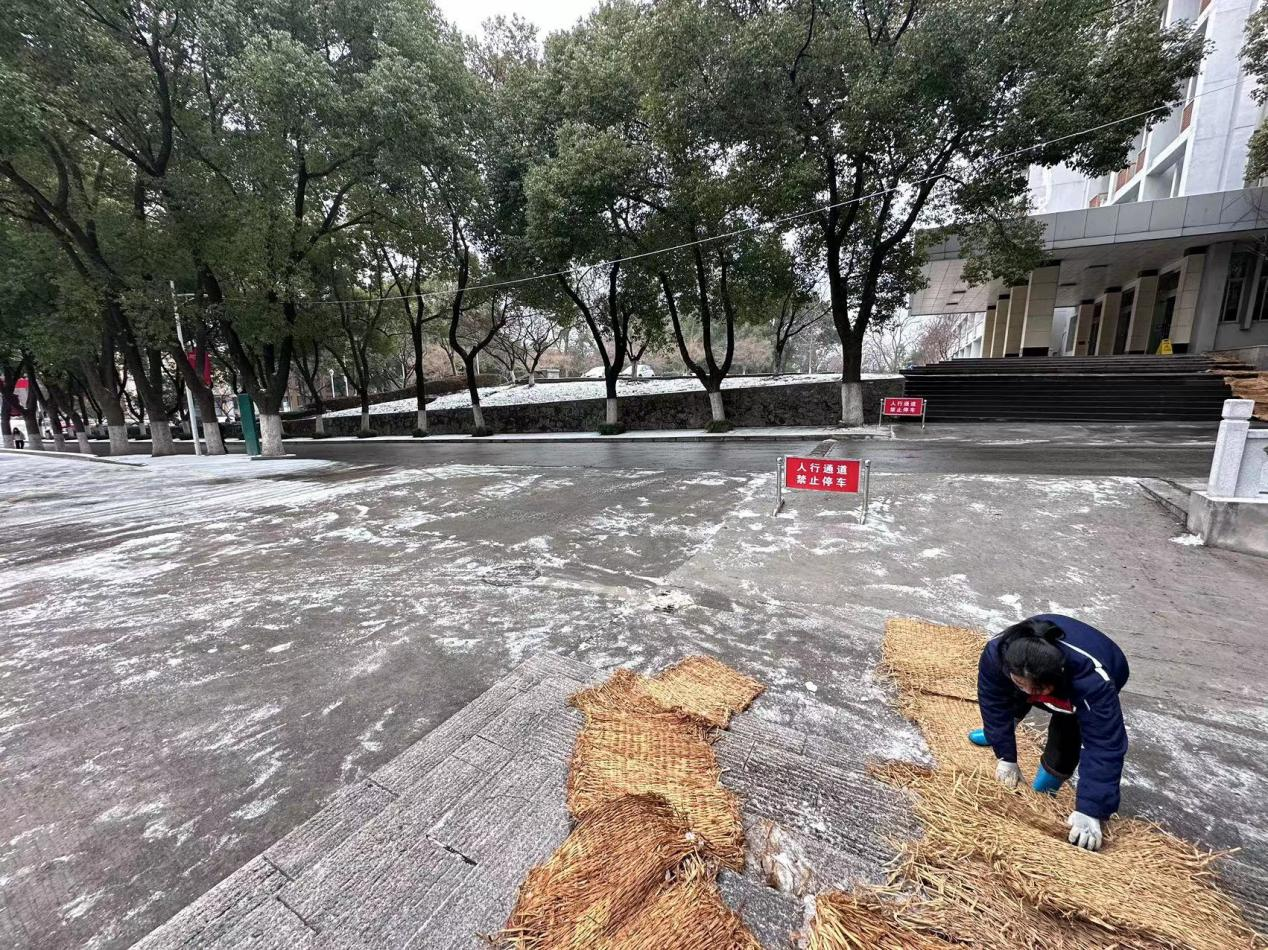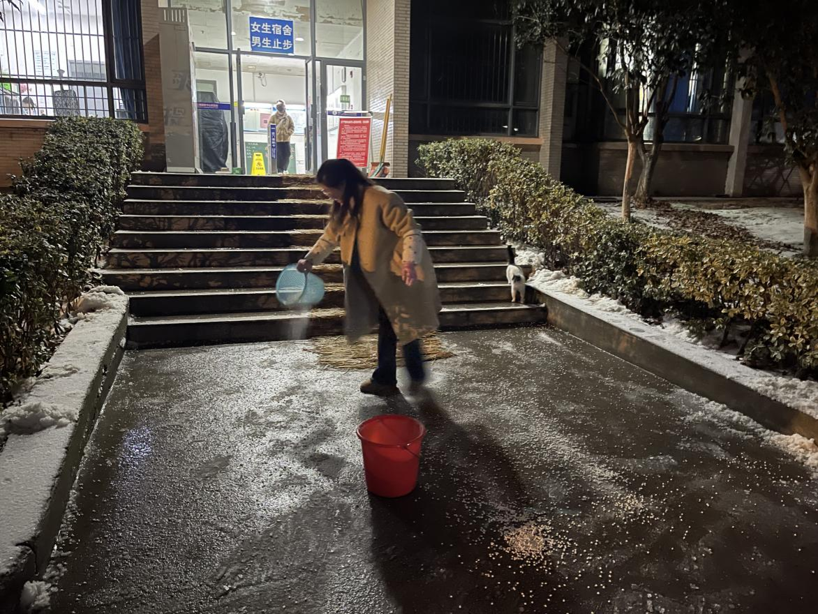 经过3个小时连续奋战,校园主干道、教学楼宇、宿舍楼前的冰冻基本清理完毕,并完成草垫铺设等防滑措施,为师生铲出平安路、扫出安全出行“绿色通道”。