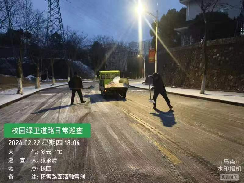 2月22日下午,我市遭受冰粒和霰天气影响,气温持续下降,道路结冰情况明显。为应对极端天气的不利影响,扎实做好雨雪冰冻防范应对工作,后勤处(集团)以雪为令,立即启动冰雪天气应急防灾预案,全体党员职工迅速集结,投入到除雪防冻工作中,确保全校道路、教学楼宇、学生公寓等重点区域出行安全,保障开学秩序。2月22日晚间,后勤处(集团)在各楼宇前铺设防滑垫,在校园主干道撒布融雪剂,递进式对主要道路、楼宇出入口等易结冰上冻地段进行融雪除冰作业。
