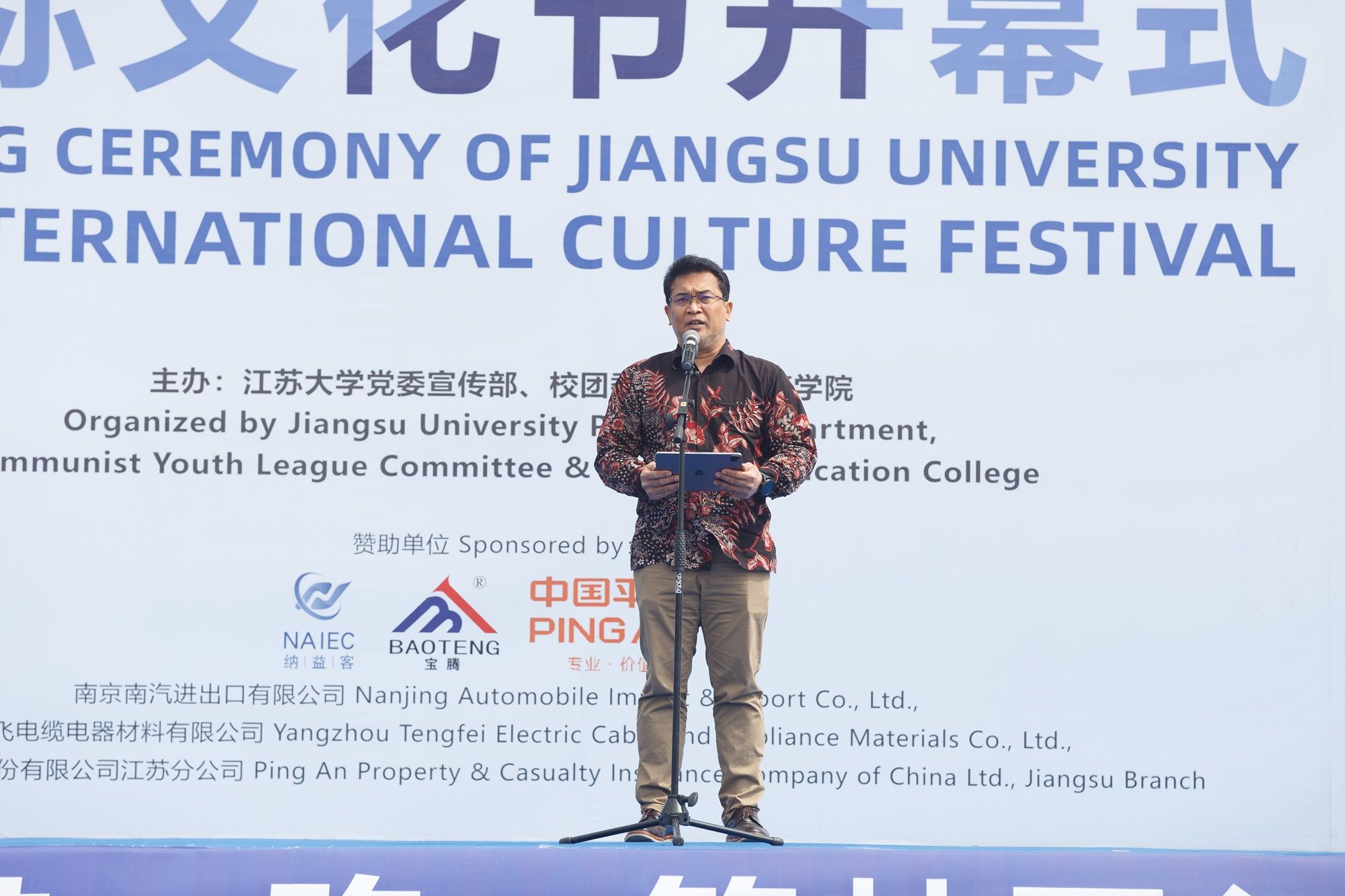 中国—东盟中心秘书长史忠俊,校党委书记李洪波,校党委常委、副校长蔡英凤,校党委常委、宣传部部长、统战部部长吴麟麟,印度尼西亚共和国驻上海总领事馆总领事贝良托·西通吉尔,埃塞俄比亚联邦民主共和国驻华大使馆公使衔参赞格塔丘,俄罗斯联邦和墨西哥合众国外交官代表,江苏省高教学会外国留学生教育管理研究委员会副理事长兼秘书长张海军,镇江市相关政府部门代表,南京南汽进出口有限公司总经理徐启仁、扬州腾飞电缆电器材料有限公司董事长张云等企业家代表以及我校相关部门主要负责人出席开幕式。
