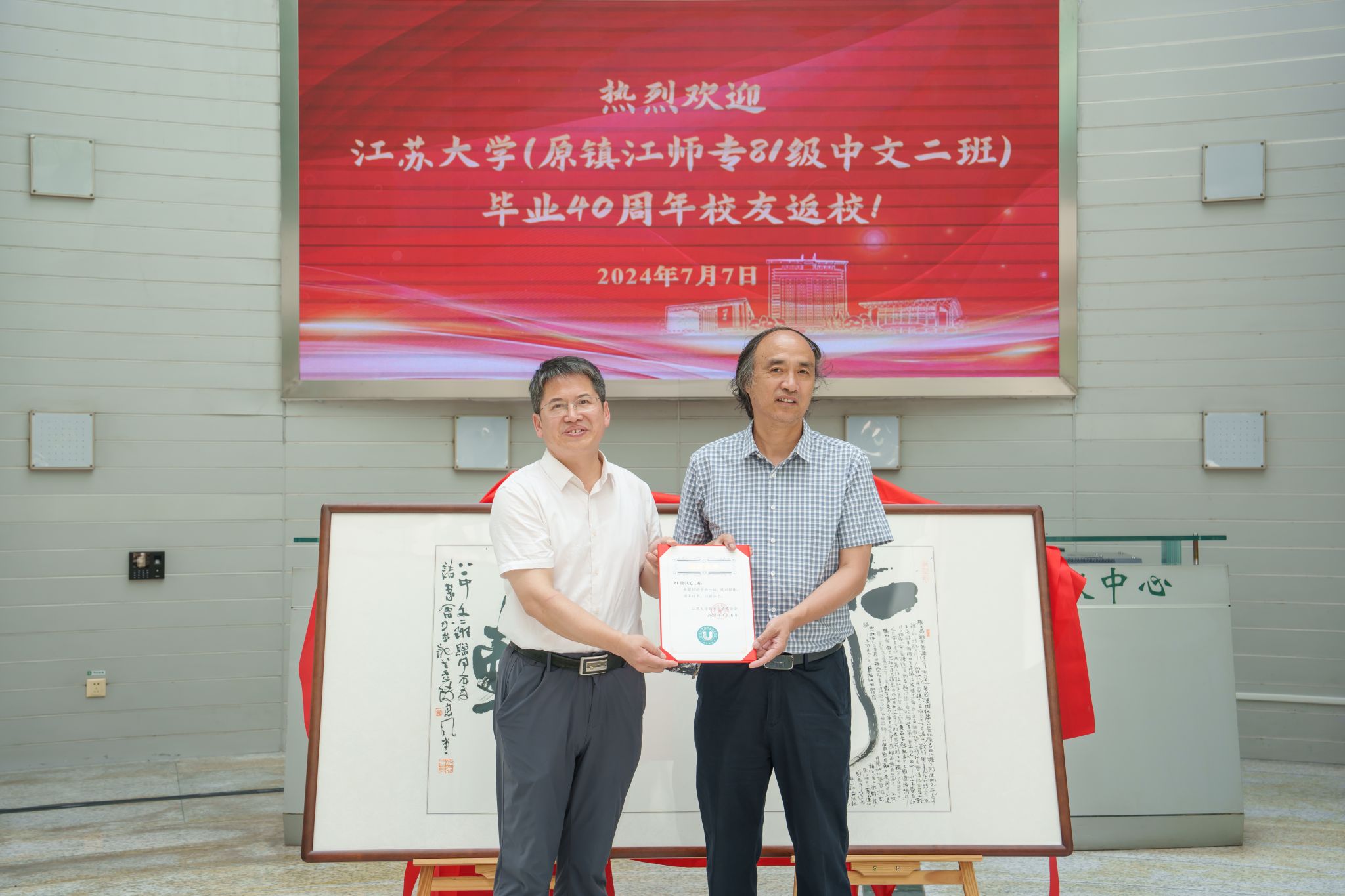李洪波对校友的到来表示热烈欢迎,向长期以来关心支持学校事业发展的校友表示感谢,他简要介绍了学校发展取得的成绩,并希望校友常回母校走一走、看一看,为学校发展贡献智慧和力量。朱卫国和李洪波共同为校友赠送的字画纪念品揭幕,邹小波为校友代表颁发捐赠证书。