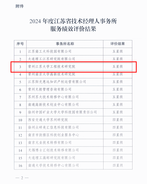 近日,江苏省技术产权交易市场公布了2024年度江苏省技术经理人事务所服务绩效评价结果,常州球速体育工程技术研究院江苏省技术经理人事务所从全省91家参评事务所中脱颖而出获五星级。