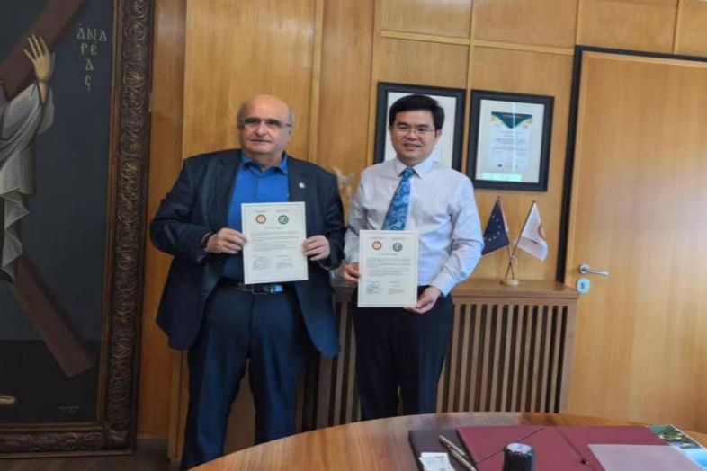 6月23日,代表团首站访问希腊帕特雷大学(University of Patras),与校长克里斯托斯•布拉斯(Christos Bouras)、学术与国际事务副校长迪奥尼修斯•曼察维诺斯(Dionissios Mantzavinos)举行会谈。双方正式签署合作意向书,致力于创建“一带一路”智慧农业技术与装备国际联合实验室,同步启动学生互换交流与境外办学项目,标志着中希高校合作迈入深度融合新阶段。当日,代表团还拜访了历史悠久的希腊雅典科学院,美国国家工程院院士、希腊科学院院士、希腊雅典国立技术大学化学工程教授Doros Nicolas Theodorou等热情接待。双方就开拓科技合作渠道、促进球速体育与希腊雅典科学院开展技术交流、高层次人才引进与输出达成共识。
