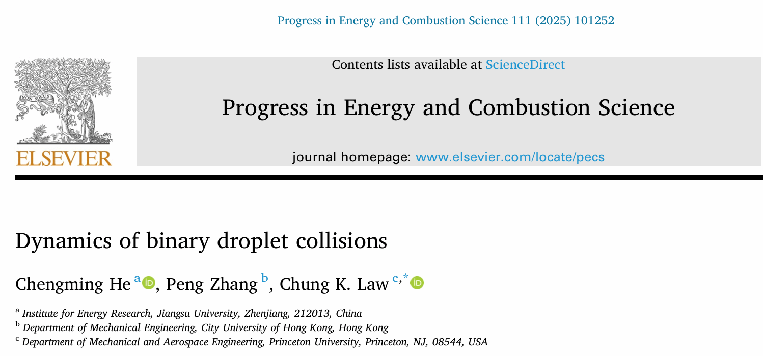近日,能源研究院金山青年特聘教授何成明联合香港城市大学副教授张鹏及美国国家工程院院士、普林斯顿大学教授Chung K. Law在能源领域国际顶级期刊Progress in Energy and Combustion Science上发表题为Dynamics of binary droplet collisions(《二元液滴碰撞动力学》)的综述论文。球速体育为第一完成单位,也是学校首次在该能源领域顶刊上发表文章。