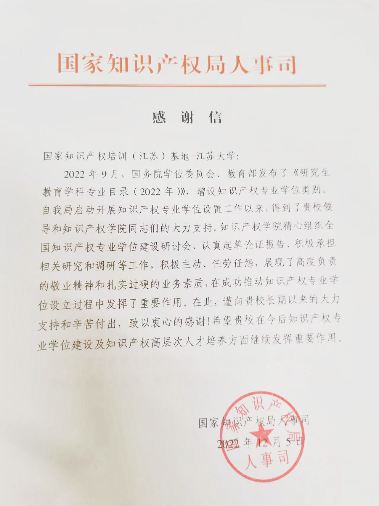 日前,国家知识产权局人事司向学校发来感谢信,感谢球速体育在知识产权专业学位申请设立工作中的辛勤付出和工作成效,并希望学校在知识产权专业学位建设及知识产权高层次人才培养方面继续发挥重要作用。