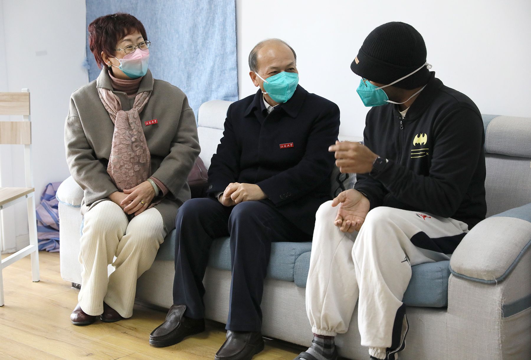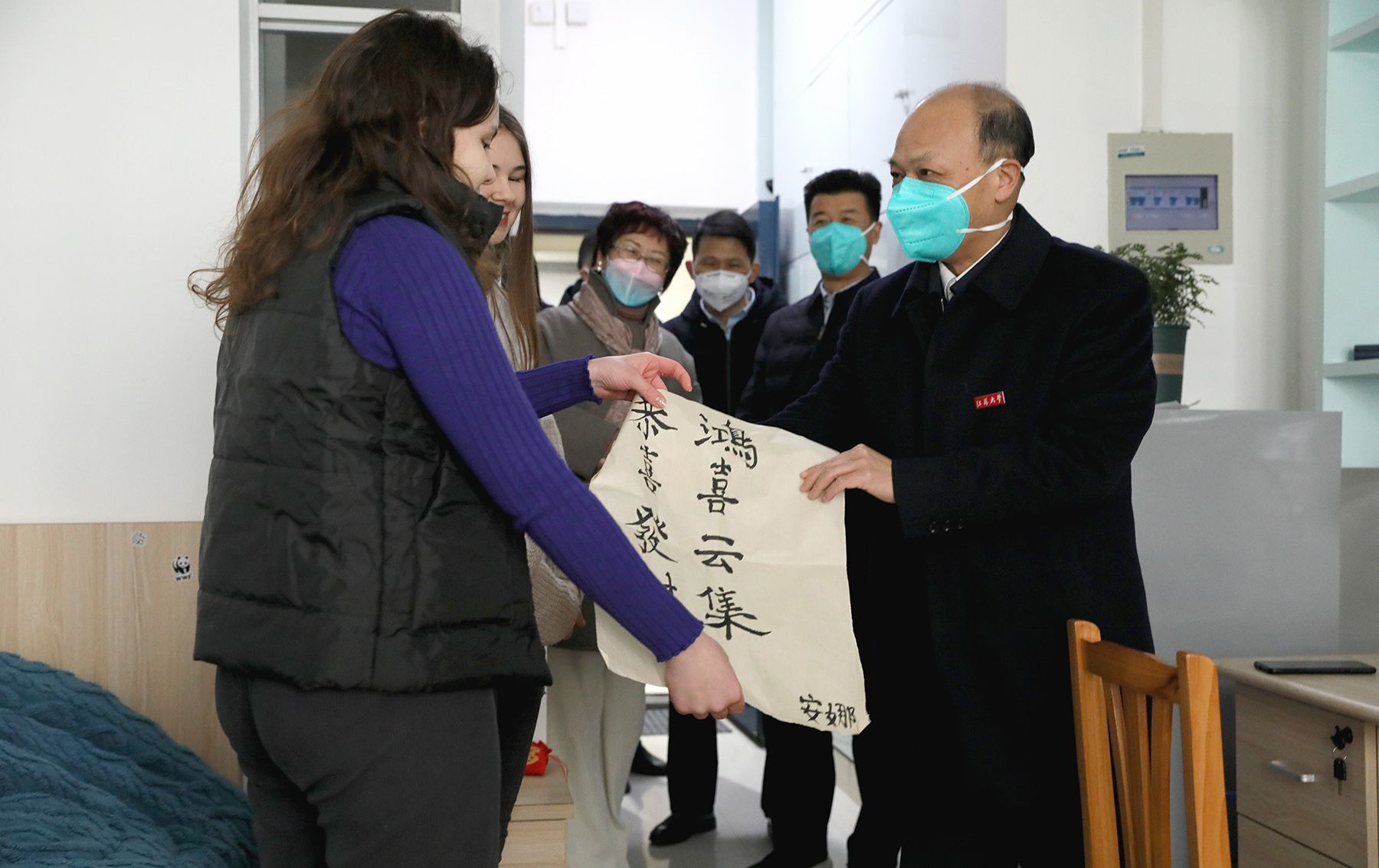 走访中,颜晓红与同学们亲切交谈,详细了解同学们在学习、就餐、住宿、生活需求等各方面情况,关心留校学生的健康、学习和生活状况。颜晓红叮嘱同学们当好自身健康的第一责任人,做好个人防护,相互关心帮助;希望同学们能够充分利用寒假留校时间加强学习,提升自我,架好中外友谊桥梁;预祝同学们在教师资格证面试和实验成果等方面取得优异成绩。