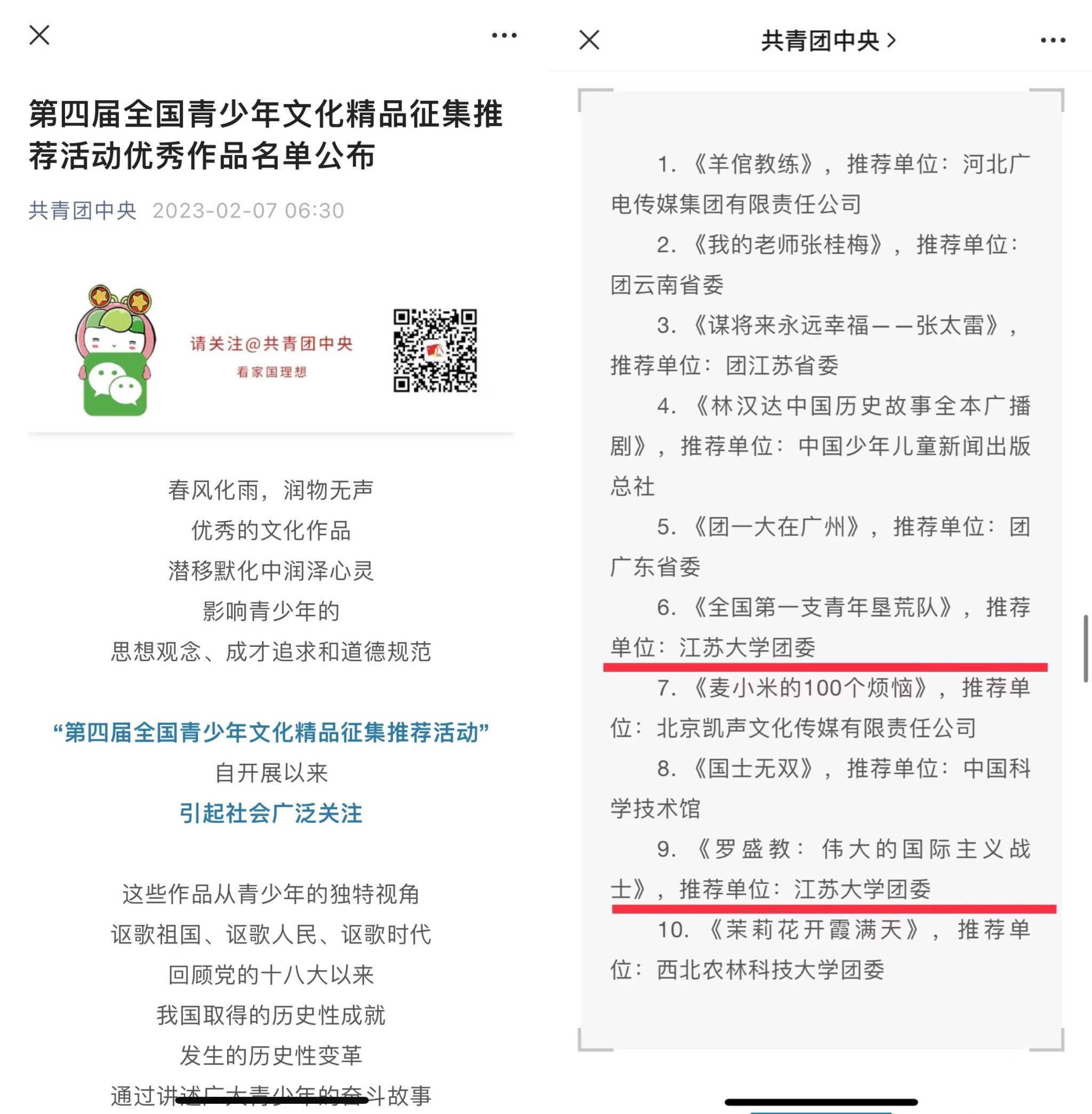 第四届全国青少年文化精品征集推荐活动由团中央宣传部组织开展,自启动以来,引起广泛关注,共评选出优秀作品70项。我校创作的广播剧《全国第一支青年垦荒队》和《罗盛教:伟大的国际主义战士》,结合迎接学习宣传贯彻党的二十大、庆祝建团100周年主题,再现了罗盛教光辉的一生和第一支青年垦荒队的青春故事,被“共青团中央”“学校共青团”官微专门发布(单条阅读量10W+),并获第二届江苏省大学生网络文化节优秀作品(音频类)一等奖,社会反响良好,有效提升了学校“网上共青团”育人实效。