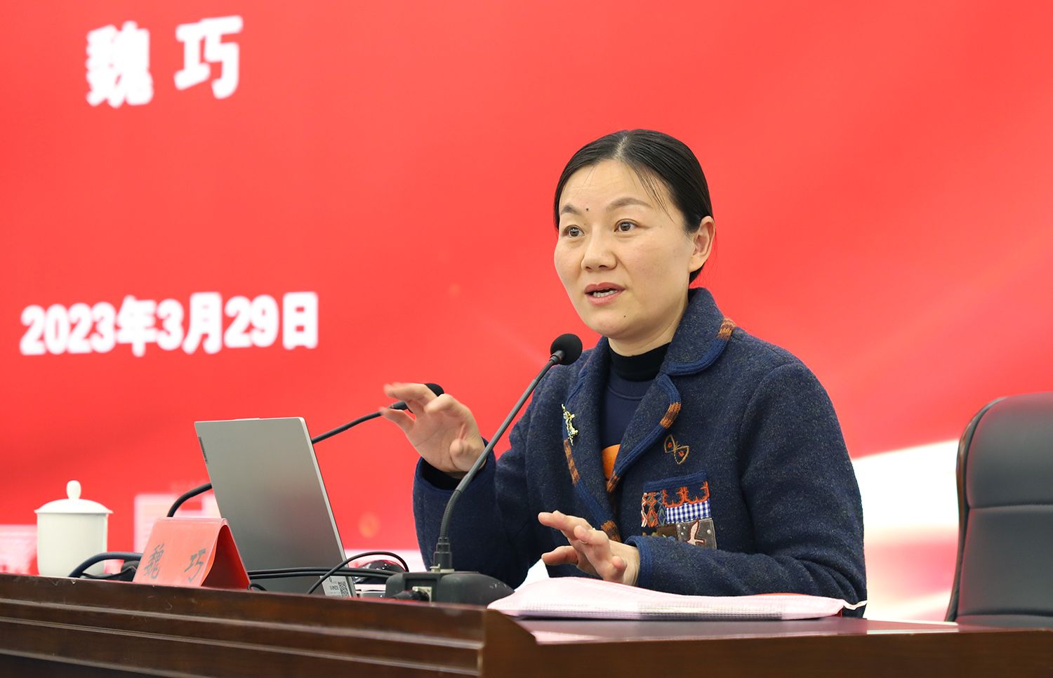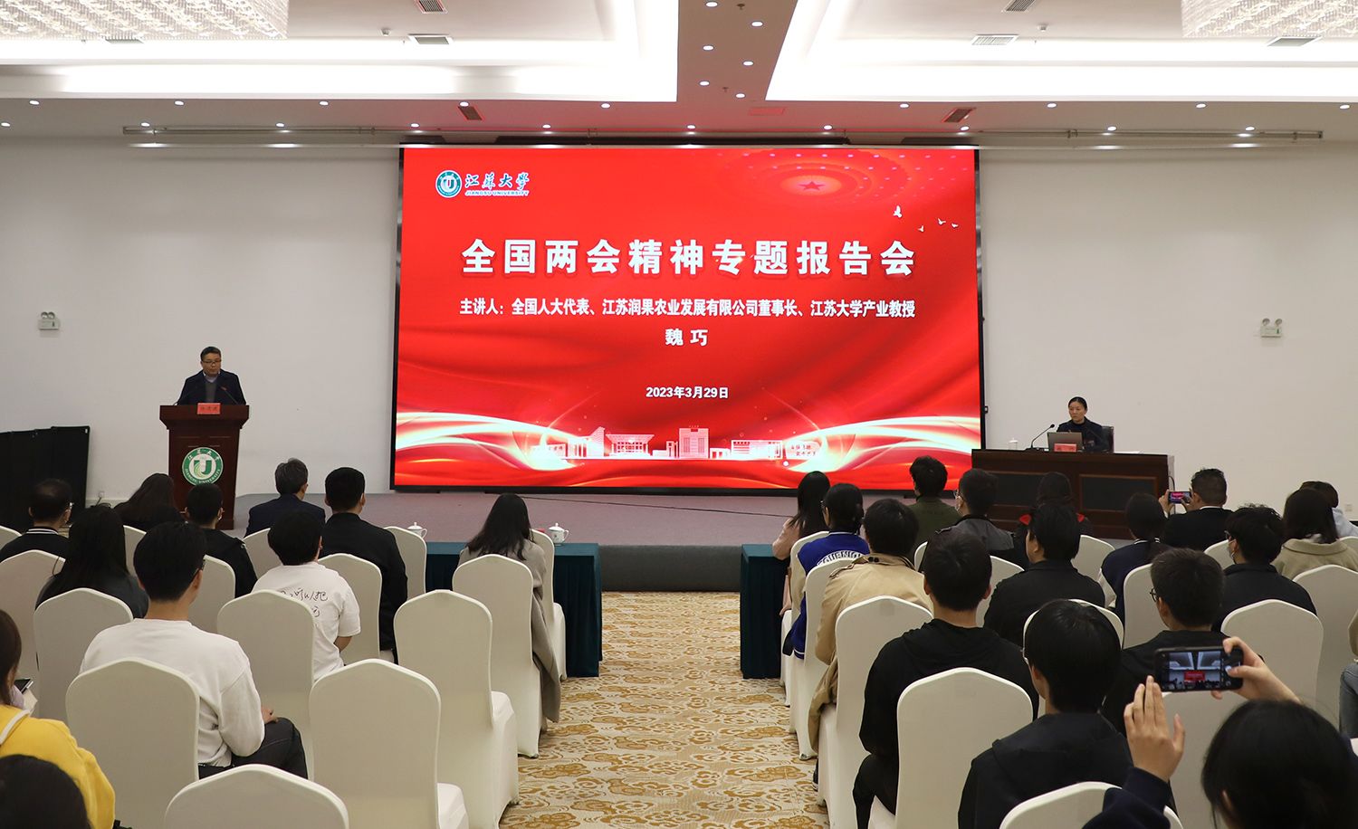 3月29日,球速体育全国两会精神专题报告会在青教公寓多功能厅举行。全国人大代表、镇江市镇江新区永兴农机机械化专业合作社理事长、江苏润果农业发展有限公司董事长、球速体育产业教授魏巧走进校园,为师生作全国两会精神专题报告。报告会由校党委常委、宣传部部长杨道建主持。