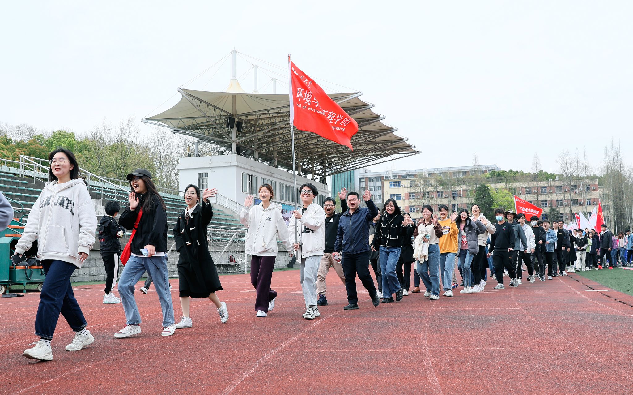 学院及机关人员组成的40个方阵、1200多名师生,高举旗帜,精神抖擞,在沿途大学生志愿者的引导下,完成校园环线健步走。