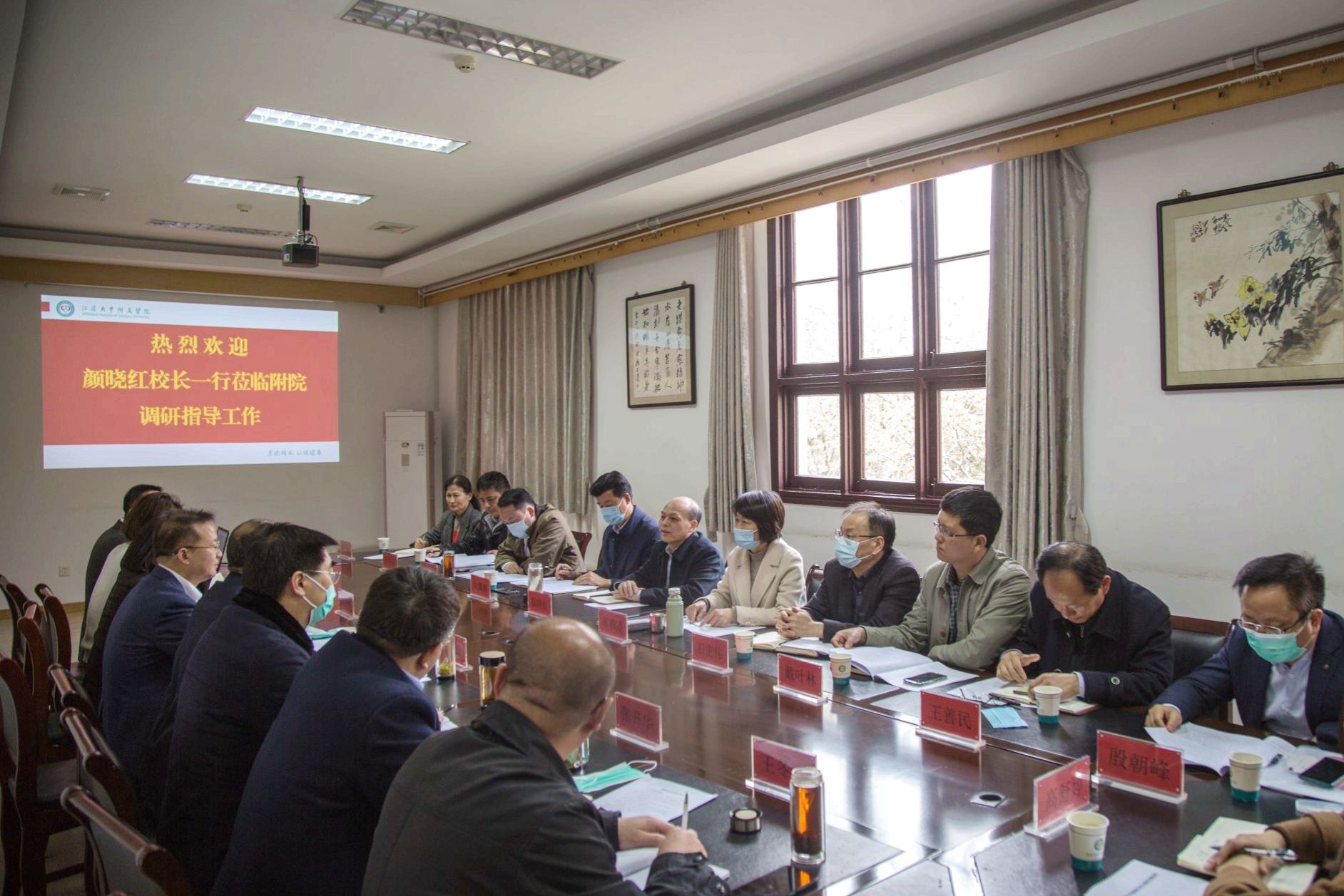 3月30日,校长颜晓红, 校党委常委、纪委书记蒋彩霞一行赴附属医院调研指导工作。附属医院领导班子成员及相关职能部门负责人参加会议。会议由校党委常委、副校长、附属医院党委书记张济建主持。