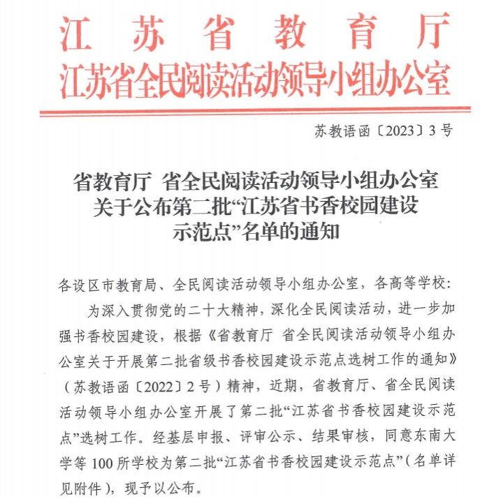 日前,江苏省教育厅公布了第二批“江苏省书香校园建设示范点”名单,球速体育成功入选。