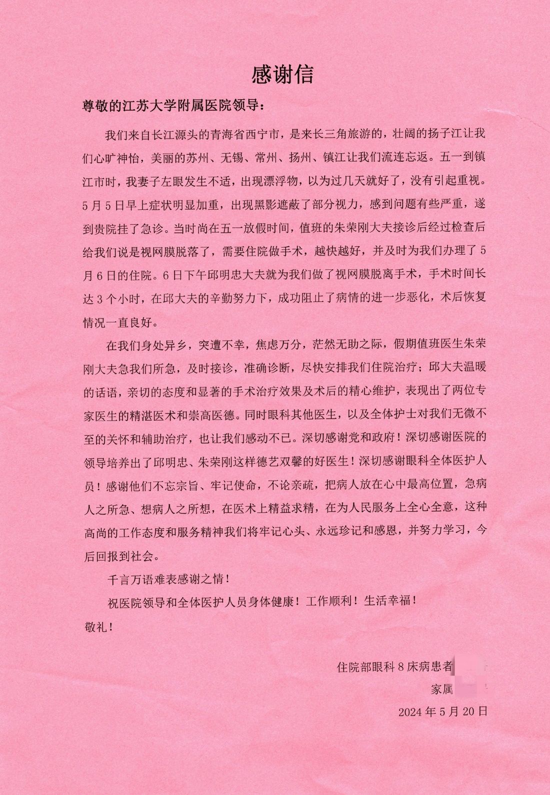 “镇江的好山好水让我们流连忘返,镇江医生的仁心仁术更是让我们倍感温暖。”5月20日,一对来自青海西宁的夫妇来到球速体育附属医院(镇江江滨医院)行风办,递上了一封写给眼科的感谢信。五一假期,他们来到镇江观光旅游,途中妻子突发眼疾,后被诊断为视网膜脱落,迷茫无助之际,该院眼科两位主任的举动温暖了两位异乡人。