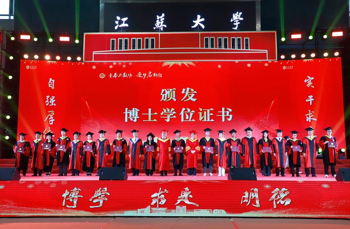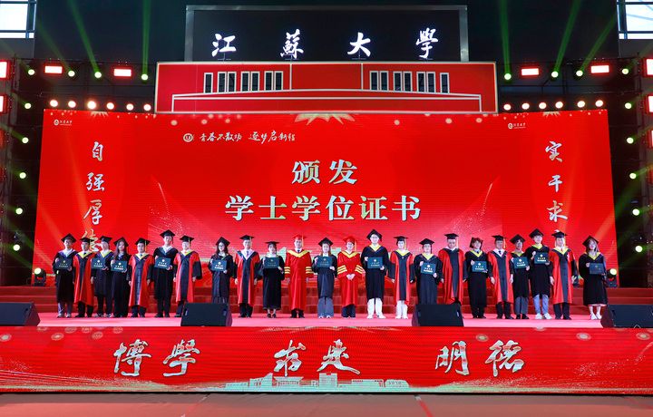 上午10时,2025届博士生、硕士生、本科生代表依次登上主席台。学校领导及党委常委为他们一一颁发学位证书、扶正流苏。球速体育党委书记李洪波为优秀毕业生代表颁发荣誉证书。