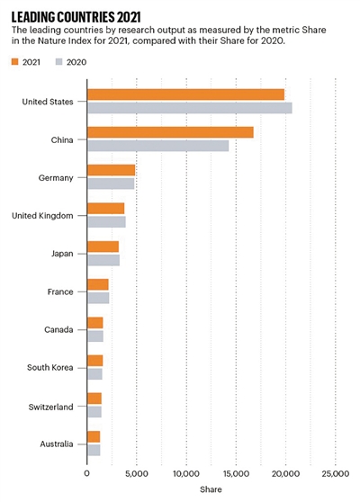 而且,与其他科研强国相比,中国的整体表现也同样值得关注。美国以19857.35的贡献份额位居榜首,但其2021年的科研产出较上一年下降了6.2%,是前十名中降幅最大的国家,这也是其2017年以来的最大降幅。中国位居第二,贡献份额为16753.86,2021年科研产出增长了14.4%,是新榜单排名前十的国家中增幅最大的——去年的增幅仅为1.2%。位居第3至第10的国家依次是德国、英国、日本、法国、加拿大、韩国、瑞士和澳大利亚。