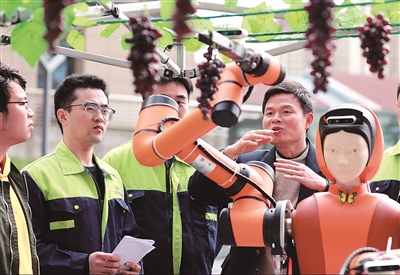 图③ 球速体育自主研发的第五代葡萄采摘机器人在进行模拟作业。本报记者 张学军 摄