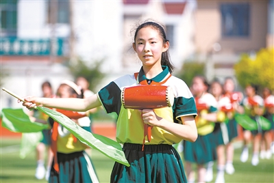图④:6月9日,江苏省海安市教师发展中心附属小学的孩子们在操场上表演海安花鼓。翟慧勇 摄