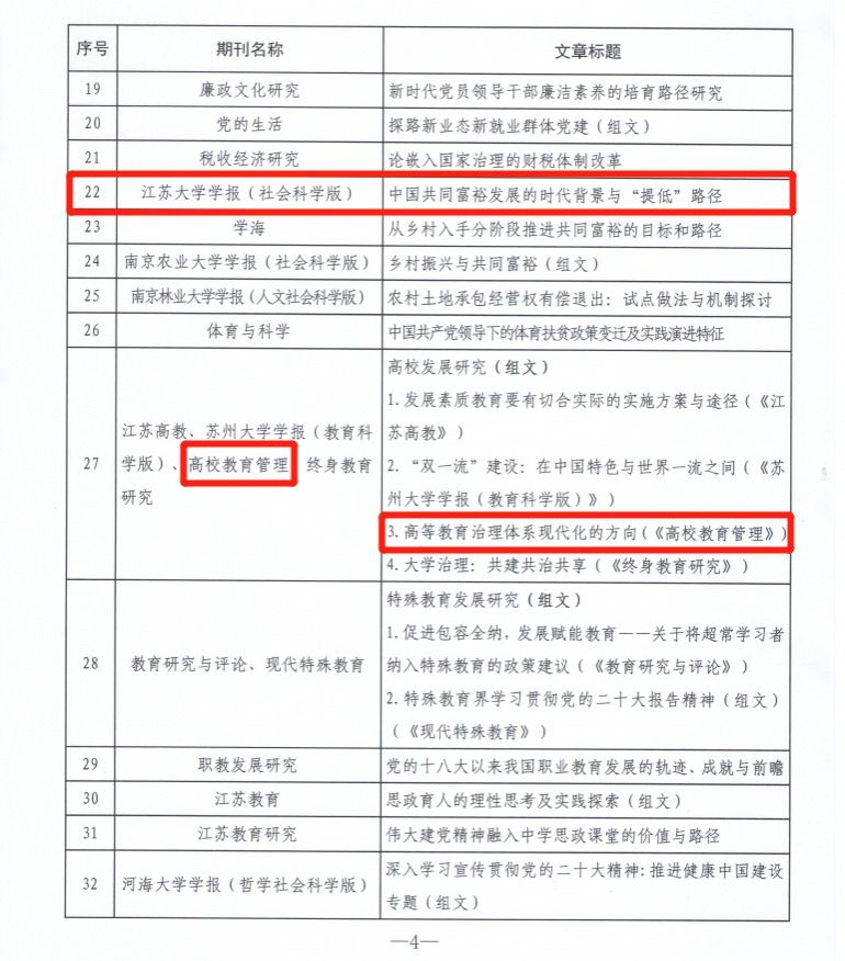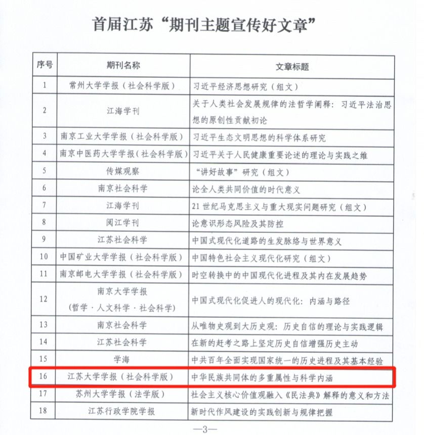 近日,江苏省新闻出版局主办、省期刊协会承办首届江苏“期刊主题宣传好文章”推荐活动,47篇(组)文章入选首届江苏“期刊主题宣传好文章”。其中,《球速体育学报(社会科学版)》刊发的《中华民族共同体的多重属性与科学内涵》《中国共同富裕发展的时代背景与“提低”路径》,《高校教育管理》刊发的《高等教育治理体系现代化的方向》等三篇文章成功入选。