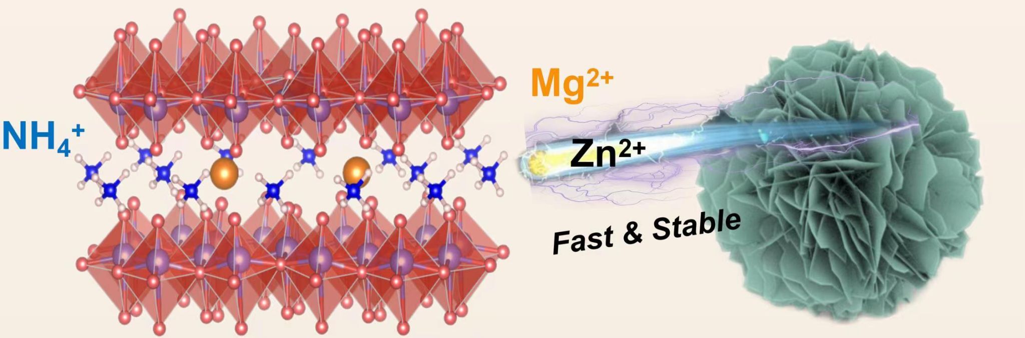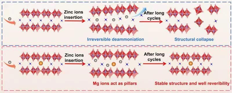 由于三维花状形态以及Mg2+和结构水的共同作用,Zn2+和V-O间的静电相互作用减弱,并构建了额外的离子通道,降低了锌离子迁移能垒。预插层的Mg2+增强了结构的稳定性,并抑制了不可逆脱氨过程,使该材料获得优异的循环稳定性。实验数据表明,适量的Mg2+掺杂可以显著提高NH4V4O10正极材料的放电容量、循环稳定性及倍率性能。改性后的NH4V4O10正极材料,展现出优秀的循环稳定性(在10A g-1电流密度下经过5000次循环后具有90.2%的容量保持率)及良好的倍率性能(25A g-1电流密度下放电比容量达到118mAh g-1)。同时,该研究团队通过采用丰富的表征手段深入研究了镁离子掺杂与形貌调控的作用机理及影响规律,并验证了该材料Zn2+/H2O共插层的储锌机制。