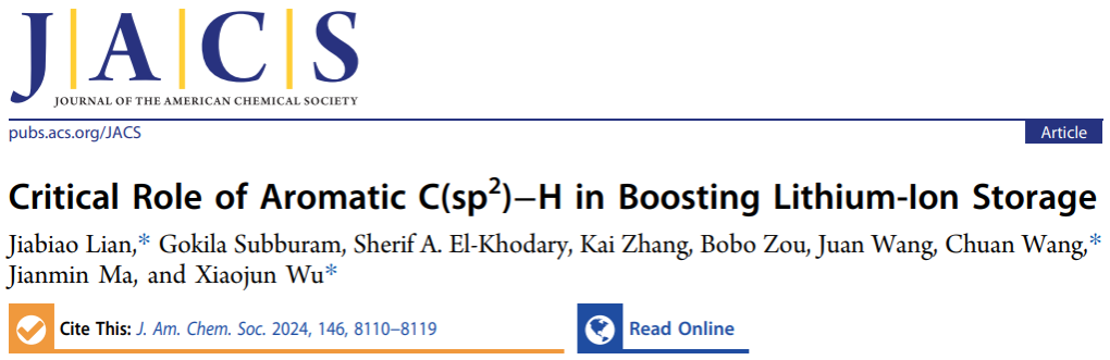 近日,我校能源研究院连加彪研究员团队在化学与材料领域顶级期刊《美国化学会志》(Journal of the American Chemical Society)上发表研究论文“Critical Role of Aromatic C(sp2)−H in Boosting Lithium-Ion Storage”。球速体育为第一完成单位,材料科学与工程学院/能源研究院博士研究生高克拉为学生第一作者,连加彪、南京工业大学王川教授和中国科学技术大学武晓君教授为共同通讯作者。