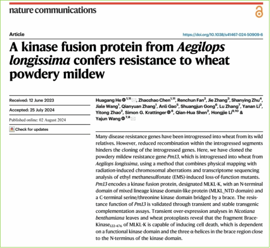 近日,生命科学学院何华纲团队联合多家单位在《自然·通讯》(Nature Communications)上发表题为“A kinase fusion protein from Aegilops longissima confers resistance to wheat powdery mildew”的研究论文,报道了来源于高大山羊草的小麦抗白粉病基因Pm13的克隆,并揭示了其生化功能和进化特性。球速体育生命科学学院为第一完成单位,何华纲为第一作者兼通讯作者,合作单位中国科学院分子植物科学卓越创新中心王亚军研究员为共同通讯作者,硕士研究生陈昭昭为共同第一作者,硕士研究生王甲乐、张倩渊参加了部分工作。