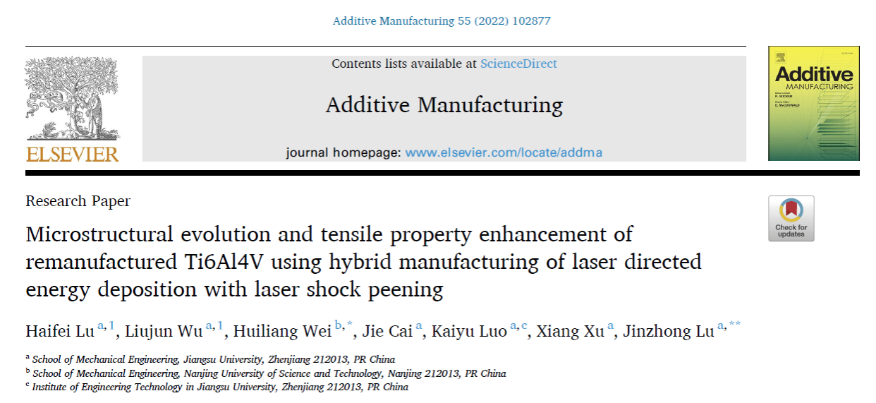 近日,经初评推荐、资格审查、专业评审、综合评审等程序,机械工程学院鲁金忠教授团队发表在《Additive Manufacturing》上的SCI高被引论文“Microstructural evolution and tensile property enhancement of remanufactured Ti6Al4V using hybrid manufacturing of laser directed energy deposition with laser shock peening(激光热力交互沉积再制造Ti6Al4V合金微观组织演变和拉伸性能强化)”入选2024年江苏省自然科学百篇优秀学术成果论文推选(球速体育唯一入选)。青年教师卢海飞副教授为第一作者,鲁金忠和南京理工大学韦辉亮教授为共同通讯作者。该工作得到国家自然科学基金(51775250)等资助。