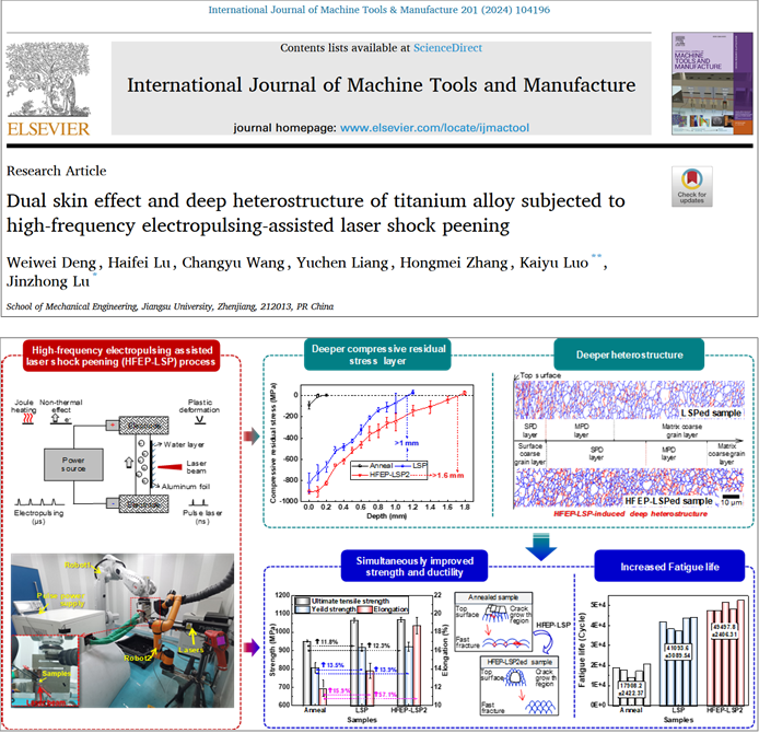 近日,我校机械工程学院鲁金忠教授团队在机械制造领域顶刊《国际机床与制造杂志》(International Journal of Machine Tools and Manufacture)上发表了题为“Dual skin effect and deep heterostructure of titanium alloy subjected to high-frequency electropulsing-assisted laser shock peening”的研究论文。该研究成果提出了一种新型高频电脉冲辅助激光冲击深度强化技术(HFEP-LSP),实现强韧性的协同提升和疲劳寿命的大幅度增长。机械工程学院博士生邓维维为第一作者,鲁金忠教授和罗开玉教授为共同通讯作者。
